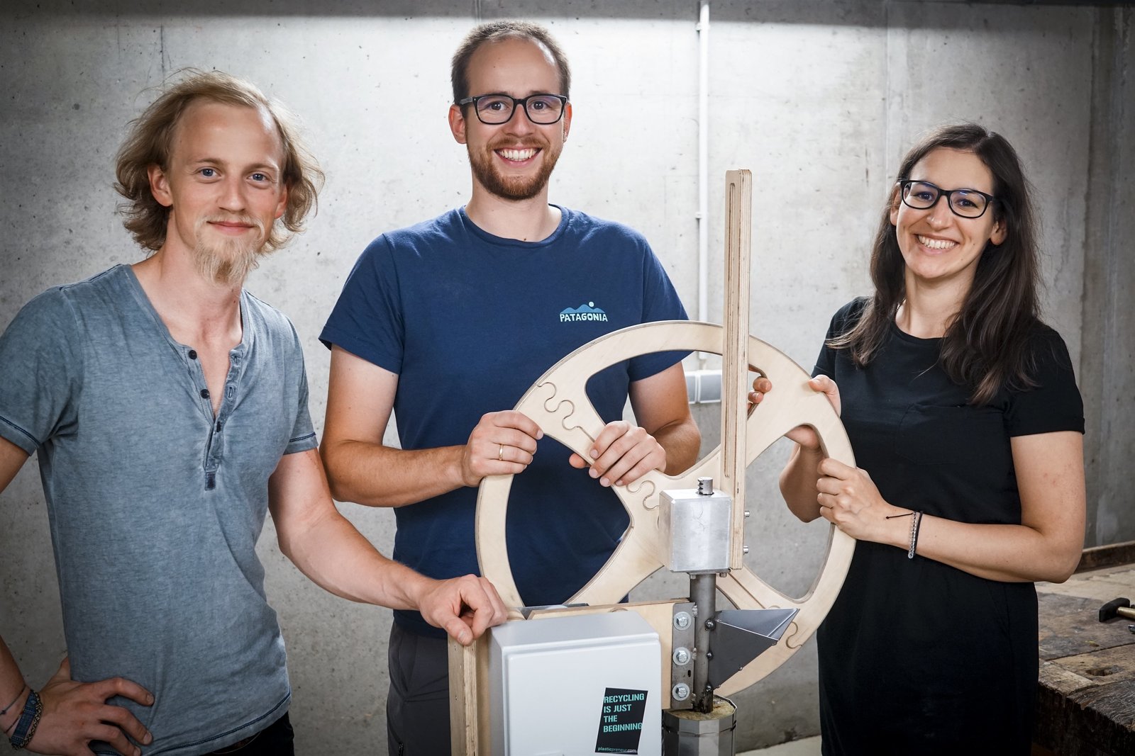 Folge 43Boris Rauter (links, Techniker), Sören Lex (Mitte, Gründer) und Raphaela Egger (rechts, Grafikerin) sind die Köpfe hinter PlasticpreneurBild: © ServusTV / Bilderfest