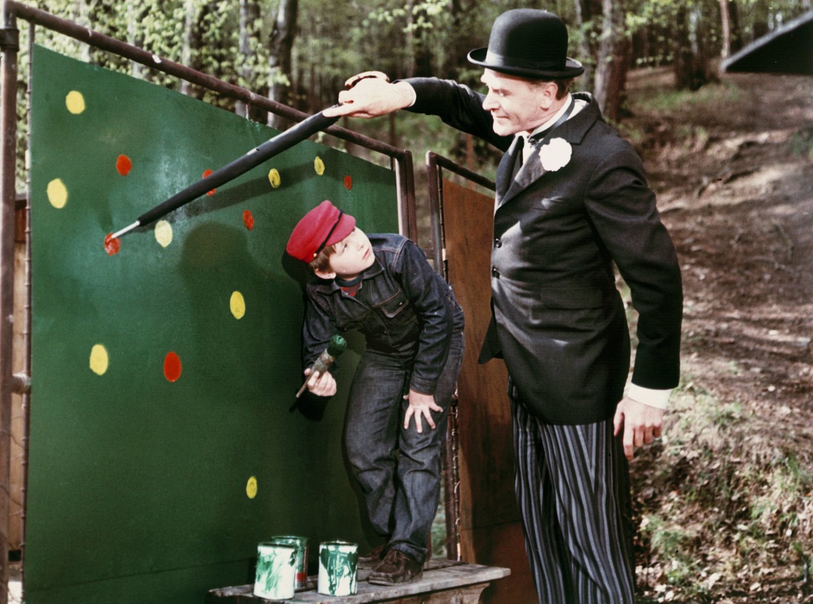 Pan Tau und der lange SonntagPan Tau (Otto Simanek, rechts) und Emil (Josef Filip) malen rote und gelbe Punkte.Bild: © BR/WDR/Alena Cerven