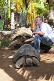 Willkommen im Otterparadies!ARD/WDR PAGAGEIEN, PALMEN & CO., "Willkommen im Otterparadies", am Donnerstag (02.07.15) um 11:35 Uhr im ERSTEN. Galapagoas-Schildkröte Tomasa wird zu ihrem Männchen zurückgebracht. Hier mit Tierarzt Dr. Heiner Müller.Bild: © WDR/Niklas Böhm