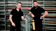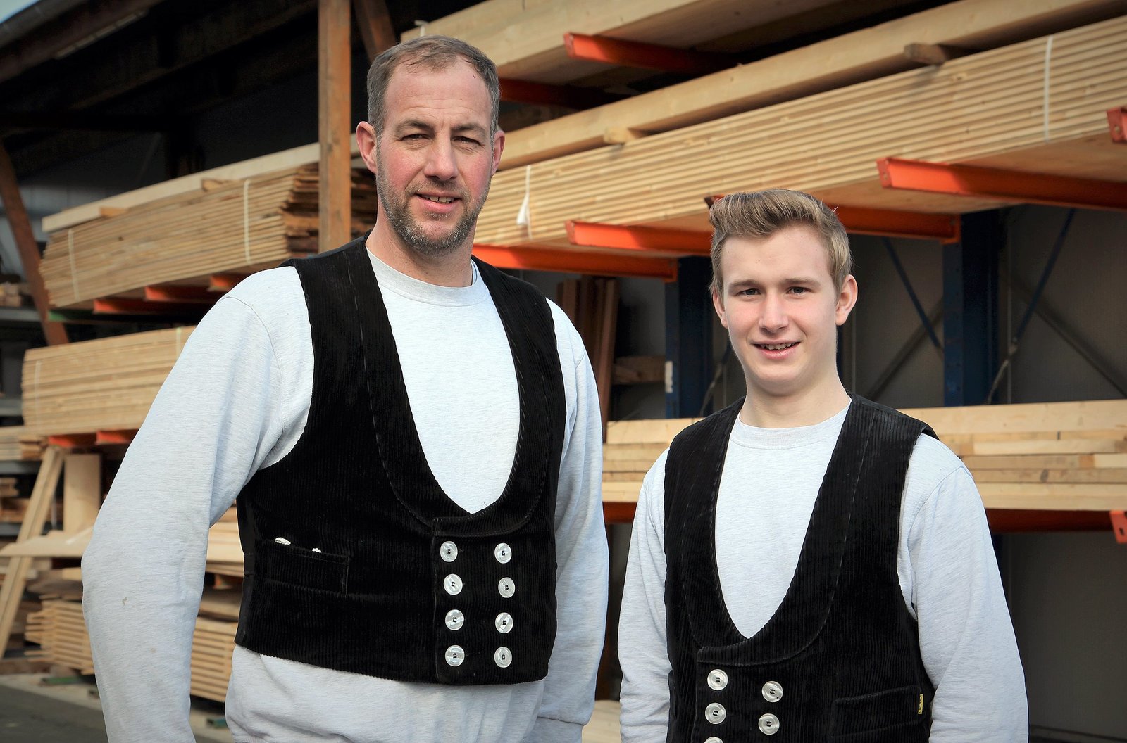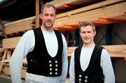 Wie Azubis Dachstühle sanieren, Fliesen legen und Prüfungen fürchtenZimmermannsmeister Burkhard (l, 44 J.) und Dachdecker-Azubi Nick (19) vor dem Holzlager.Bild: © WDR/ume GmbH/Christine Alvarez