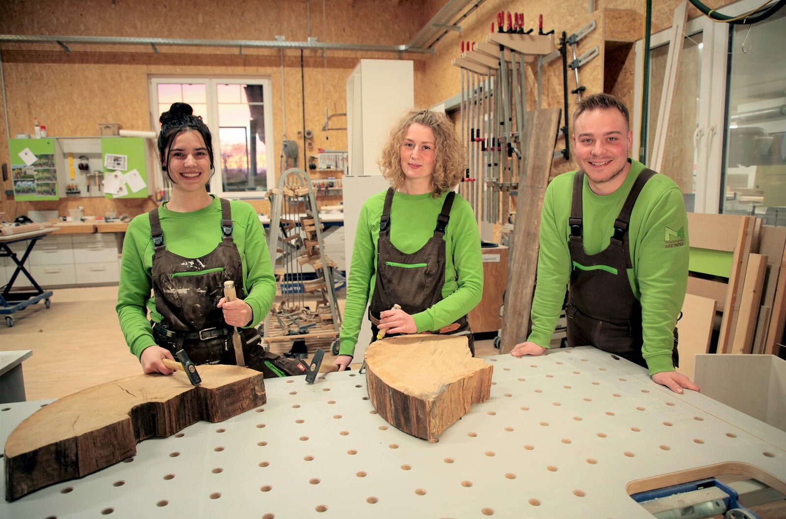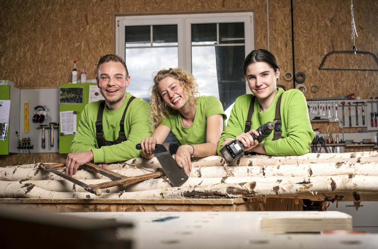 Vorsicht Glas - Gina und Heather bauen Türen einSie sind Azubis und sie lieben ihren Job. Was wird sie diesmal auf den Baustellen erwarten? Oft wachsen die Auszubildenden über sich hinaus, manchmal geht auch alles schief. Wo gehobelt wird, fallen eben Späne. Zum Glück sind ihre Ausbilder*innen, die Meister*innen und Gesell*innen, eng an ihrer Seite. - v.l.n.r. Niklas (29 J.), Tischler-Geselle, Gina (26 J.), Tischlerin-Azubi im 2. Lehrjahr, und Heather (21 J.), Tischlerin-Azubi im 2. Lehrjahr.Bild: © WDR/Ben Knabe / WDR Kommunikation/Redaktion Bild