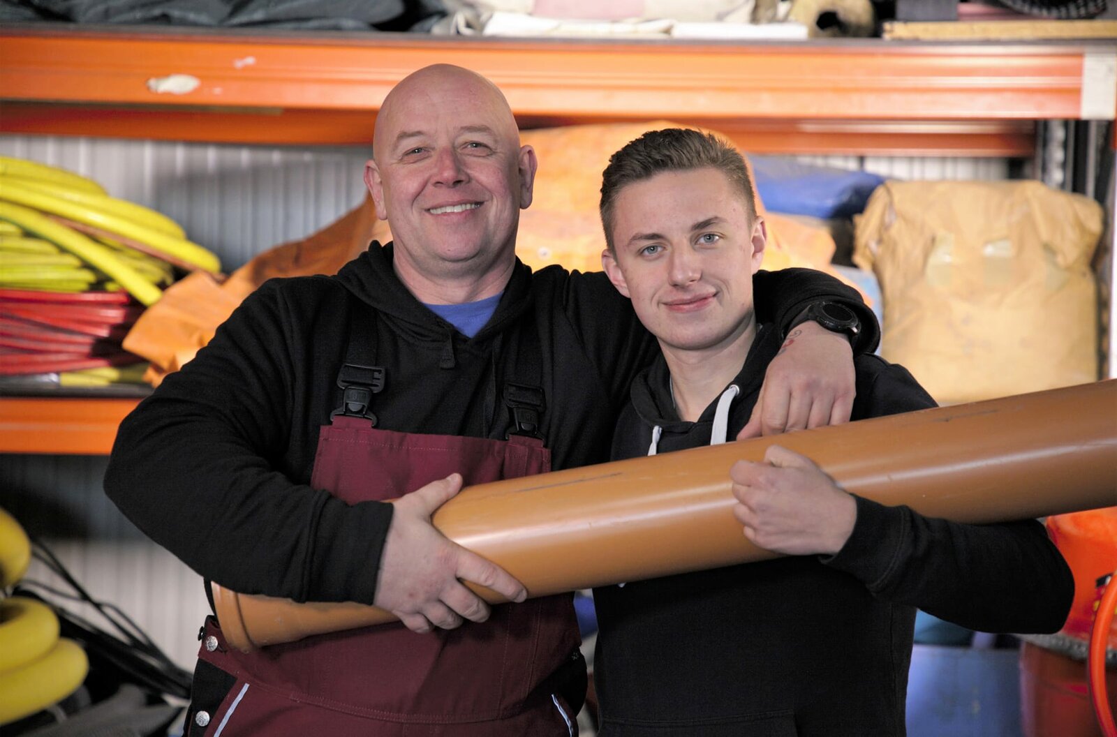 Wie Azubis Schindeln tackern, Steine metzen und Lötlampen entflammenRohrreiniger Sven (48) und Azubi Luca (19) ergänzen sich perfekt.Bild: © WDR/Warner Bros. International Television Production Deutschland GmbH