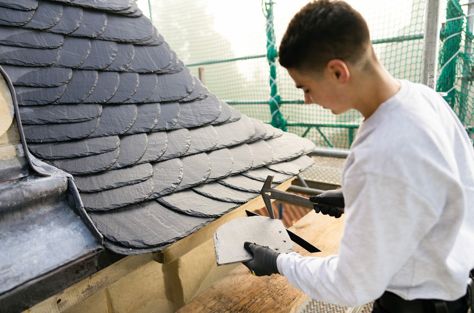 Wie Azubis Schindeln tackern, Steine metzen und Lötlampen entflammenSteinmetzin-Azubi Marina (22) braucht viel Konzentration bei der Arbeit.Bild: © WDR/Warner Bros. International Television Production Deutschland GmbH