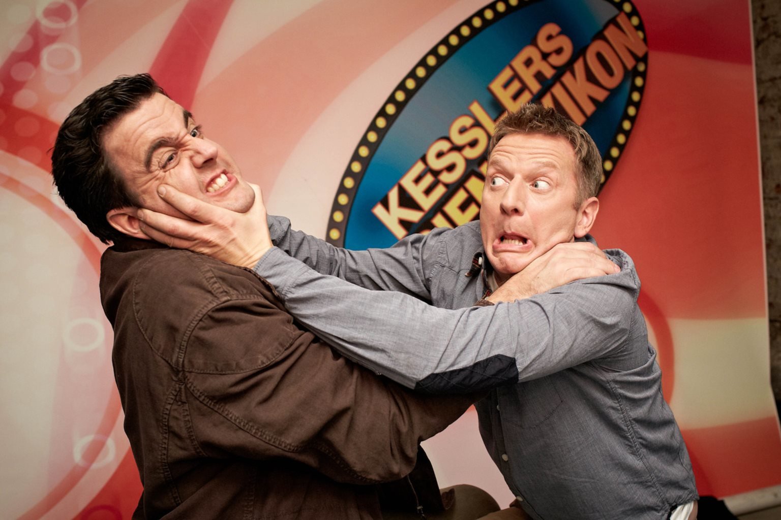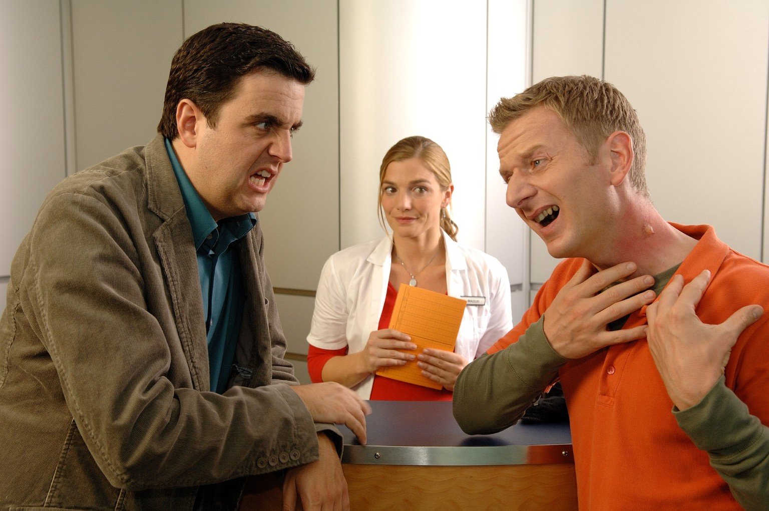 Das Fitness-StudioWährend Svens (Michael Kessler, r.) angestochener Hals immer weiter anschwillt, wird Bastian (Bastian Pastewka, l.) vorgezogen und bekommt sofort einen Termin beim Arzt.Bild: © Sat.1 Eigenproduktionsbild frei