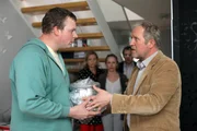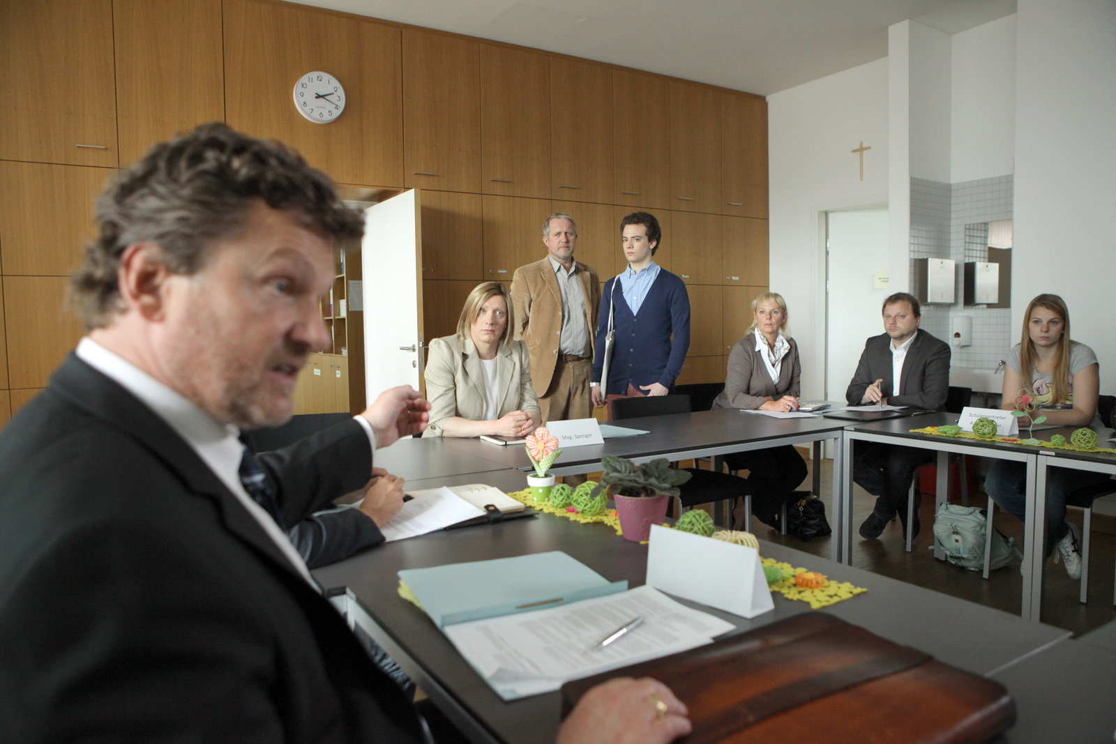 Toleranz"Paul Kemp - Alles kein Problem", "Toleranz." Heinrich hieß Tims Klassenvorstand noch vor den Ferien. Als Henriette kam Prof. Sprenger ins neue Schuljahr. Dirketor Lainer sucht Paul Kemp auf und ersucht ihn um Vermittlung im schwelenden Konflikt. Besonders der Elternvereinsobmann Dr. Martin hat sich die Entferung von Henriette von der Schule zum Ziel gesetzt. Paul arbeitet auf deren Verbleib hin. Zufällig ist Dr. Martin der Direktor jener Bank, bei der Pauls Schulden zu unbewältigbarer Höhe aufgelaufen sind. Er bietet Paul die Tilgung des Kredites an, falls er seine Gesinnung wandelt und für Hentriettes Entfernung eintritt. Paul ist empört. Empört ist auch Luis, dass ihn seine Mutter intensiv zur Heirat mit Lisa drängt. Ihn haben die vorsichtigen Hinweise auf Lisas psychischer Labilität durch Paul und Ella nachhaltig irritiert. Endlich gesteht Ella Paul ihre Schwangerschaft. Seine Reaktion überrascht sie.Im Bild (v.li.): Gabriel Barylli (Dr. Martin), Simon Schwarz (Henriette Sprenger),Bild: © ORF2