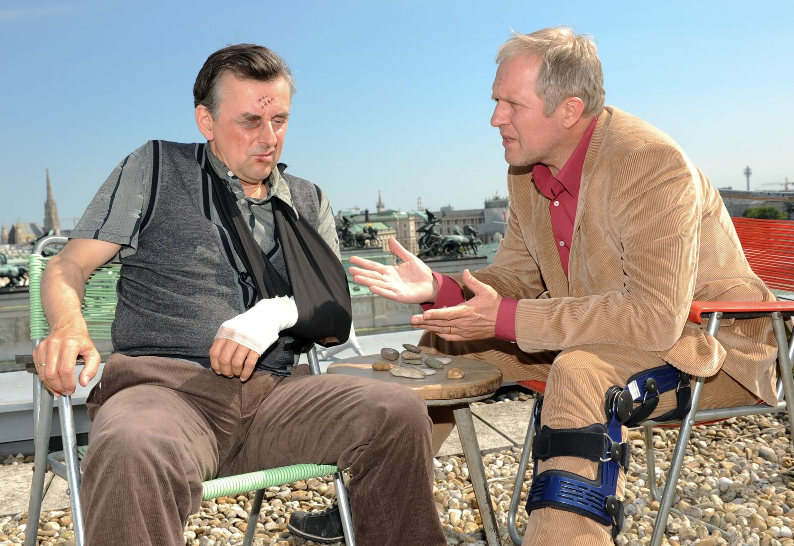 Die Falle"Paul Kemp - Alles kein Problem", "Familienbande." Der Ehekonflikt im Hause Kemp bekommt interessante Facetten. Während Ella die Beziehung zu Nachbar Christian stilllegt und ihre Ehe retten möchte, hatte Paul einen "One-Night-Stand" mit Lisa, die diese Begegnung aber nicht als Laune eines Augenblicks sehen möchte. Pauls Mutter beschließt in ein Altersheim zu gehen, möchte aber ihre beiden Söhne, die seit vielen Jahren nichts miteinander reden, endlich versöhnt sehen. Im Zentrum des damaligen Streites stand Ella, die Paul seinem eigenen Bruder Luis ausgespannt hatte. Als Mediator trifft Paul auf Hermann und dessen beiden Söhne, die es auf das Haus des Vaters abgesehen haben und ihn deshalb ins Altersheim abschieben wollen. Aber auch Pauls Mutter lernt Hermann kennen und findet diesen spontan sehr sympathisch.Im Bild (v.li.): Gerhard Liebmann (Rudi Schober), Harald Krassnitzer (Paul Kemp).Bild: © ORF2