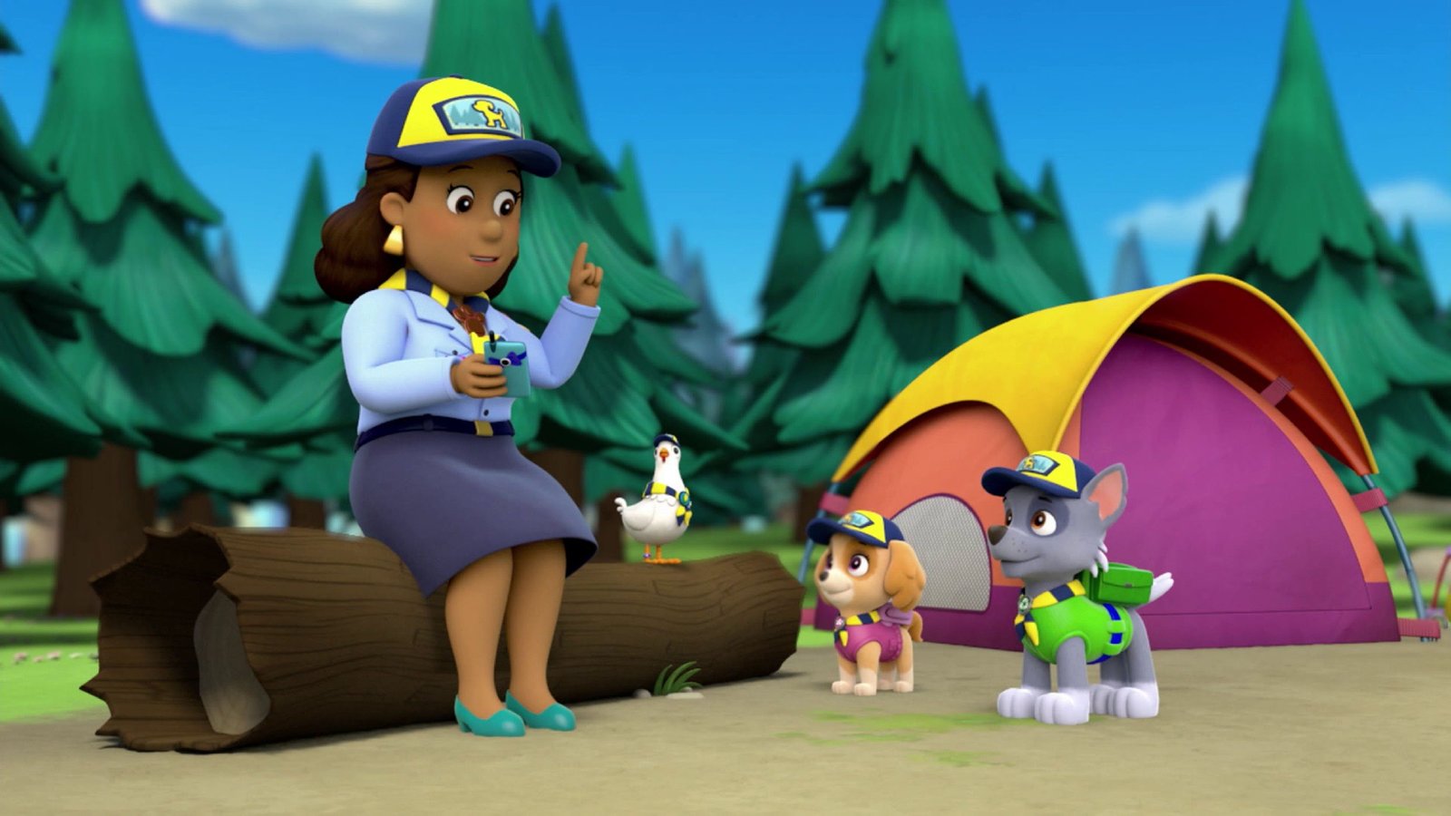 Die PfotenfinderBürgermeisterin Gutherz, Henrietta, Skye und Rocky (v. li. n. re.) haben ein Zeltlager errichtet.Bild: © SUPER RTL