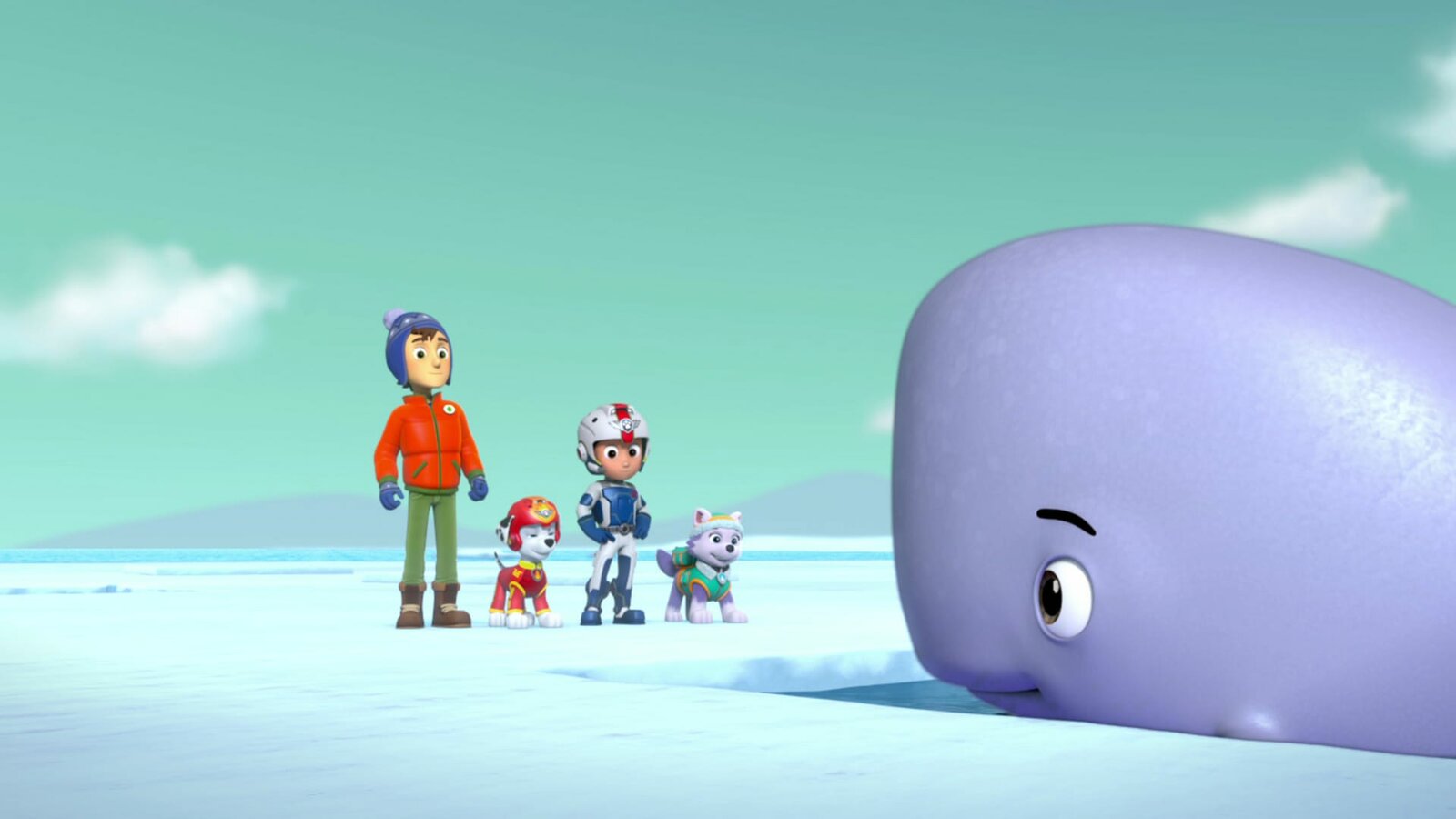 Die Fellfreunde retten ein Wal-BabyL-R: Jake, Marshall, Ryder, Everest, Baby whaleBild: © ViacomCBS