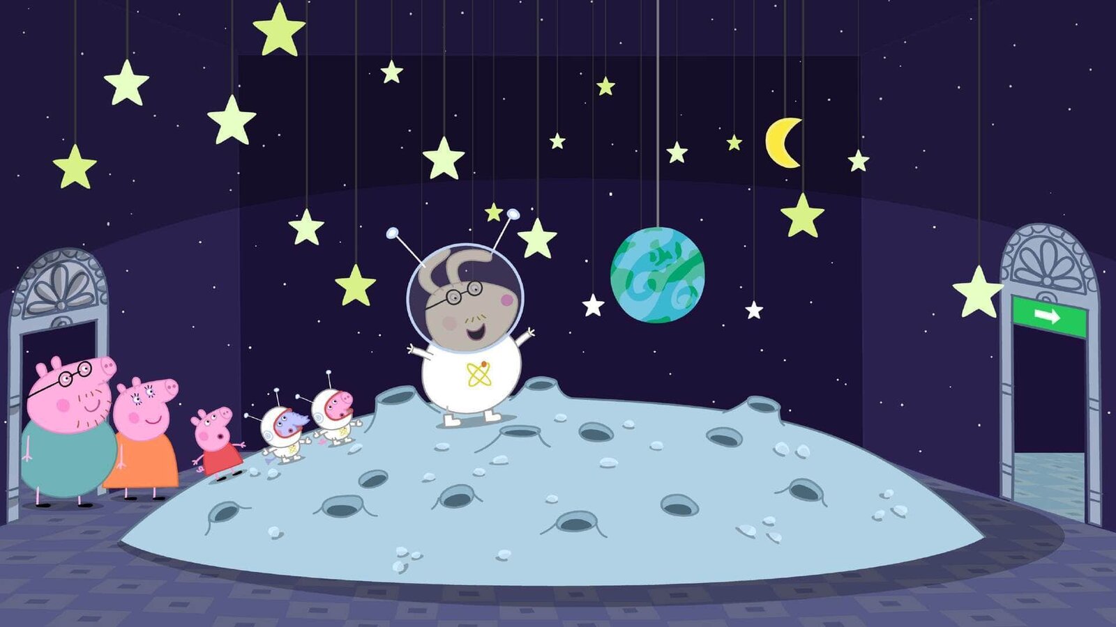 Die Reise zum MondPeppa (3.v.l.) und ihre Familie fahren zum Museum, um dort die Mondausstellung zu sehen. Edmund Elefant, ein Freund von Schorsch, ist auch dabei. Gemeinsam erleben sie eine fast-richtige-Reise zum Mond.Bild: © SUPER RTL