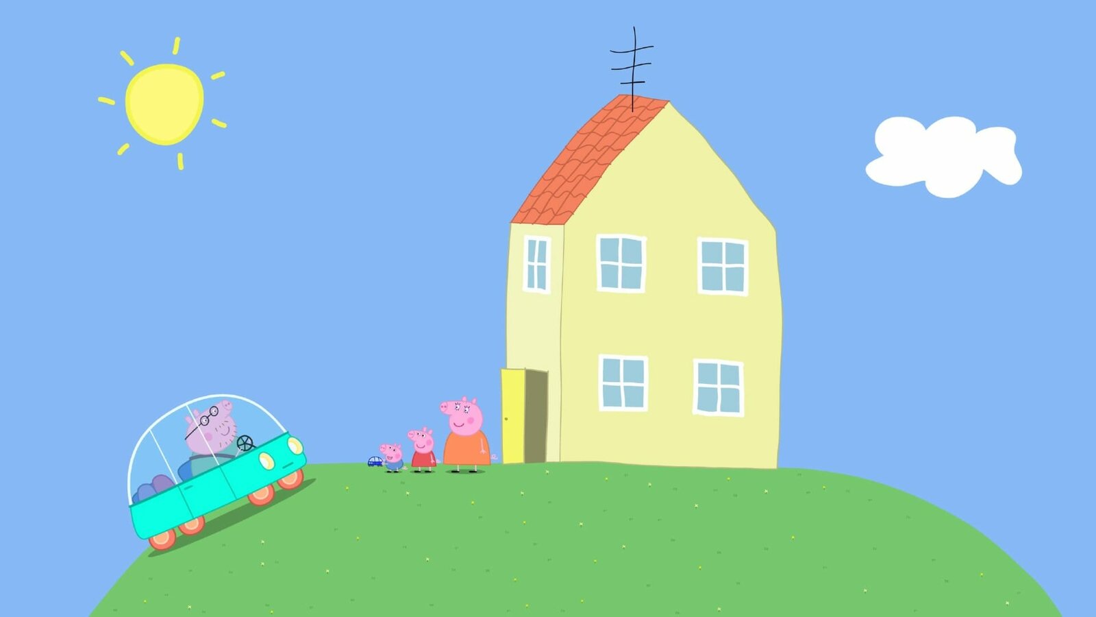 Das ElektroautoPeppa und Schorsch spielen mit Spielzeugautos. Da kommt Papa Wutz (li.) mit einem echten Elektroauto angefahren.Bild: © SUPER RTL