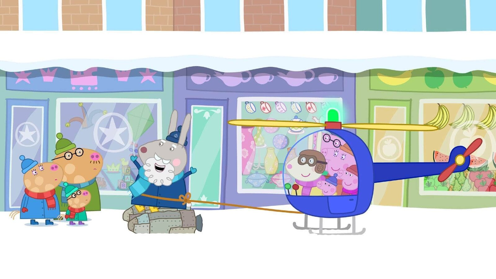 Opi Mümmels DüsentriebFrau Mümmel und Familie Wutz (re.) haben Opi Mümmel (mi.) mit einem Hubschrauber von einem schneebedeckten Berg gerettet, nachdem er mit seinem Raketenrucksack hoch hinaus schoss und dort feststeckte.Bild: © SUPER RTL