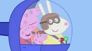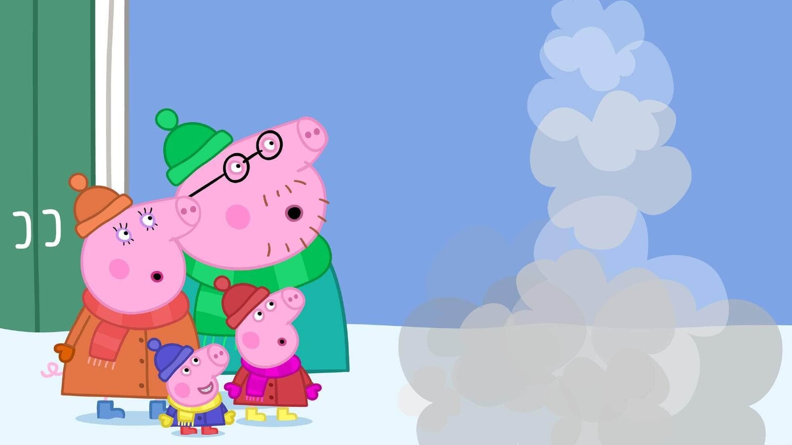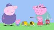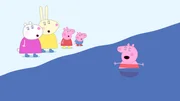 Opi Mümmels DüsentriebEs ist ein schöner, verschneiter Tag und Opi Mümmel entscheidet sich dazu, einen Raketenrucksack zu bauen. Als er ihn Peppa und Schorsch zeigt, schießt er hoch hinaus und landet auf einem schneebedeckten Berg.Bild: © SUPER RTL