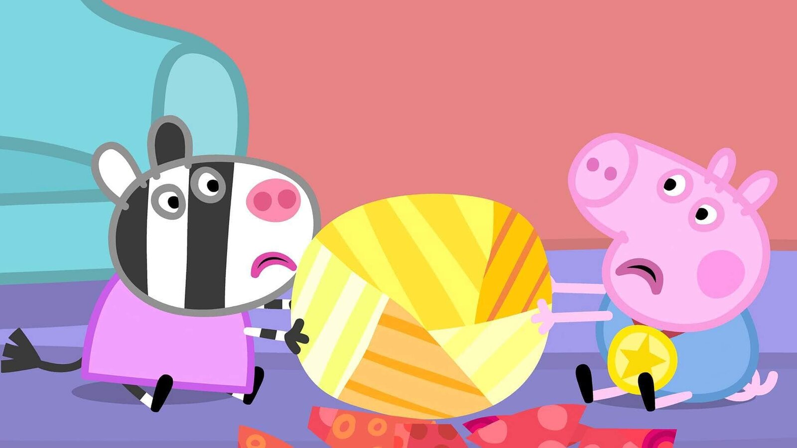 Edmund Elefant feiert GeburtstagWeil George (r.) das Geschenk ganz für sich allein haben will, müssen Peppa und die anderen Helfer eingreifen.Bild: © SUPER RTL