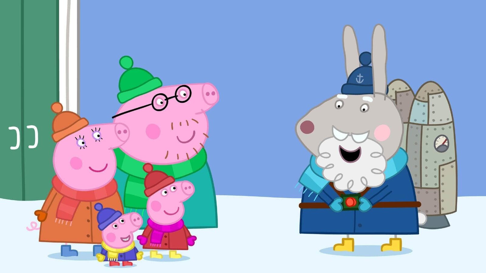 Opi Mümmels DüsentriebEs ist ein schöner, verschneiter Tag und Opi Mümmel entscheidet sich dazu, einen Raketenrucksack zu bauen. Stolz will er ihn Schorsch, Peppa und ihren Eltern vorführen, was jedoch etwas nach hinten losgeht...Bild: © SUPER RTL