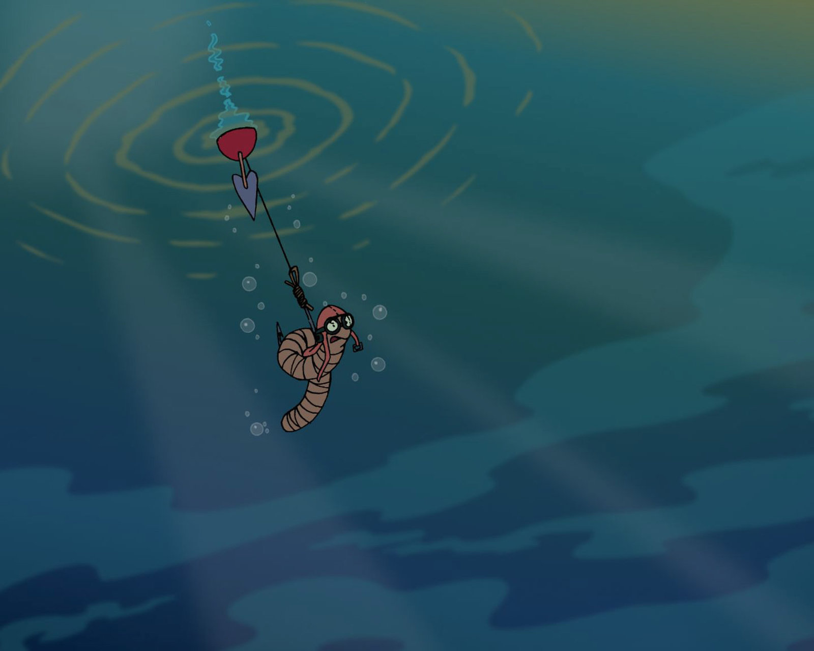 Pettersson zeltetDer Taucherwurm soll einen Fisch zu Pettersson Angel locken.Bild: © ZDF/TV Loonland