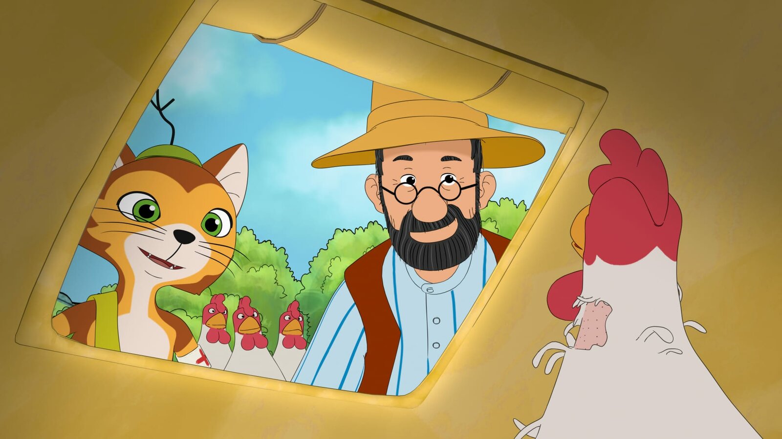 Eine stachelige FreundschaftPettersson und Findus merken, dass die Hühner in ihrem Stall sich verärgert beraten und etwas im Schild führen.Bild: © ZDF/2021 Edel Germany GmbH