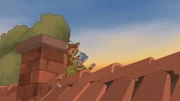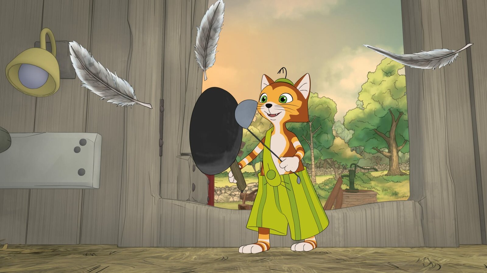 Das Rätsel vom Stiefel im GoldfischglasNachdem er selbst schon ein paar Stunden wach ist, weckt Findus die Hühner um 6 Uhr morgens mit einem wirklich sehr lauten Bratpfannen-Gong. Da fliegen sogar ein paar Federn herum vor Schreck!Bild: © ZDF/2021 Edel Germany GmbH