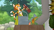 Das ZischmonsterFindus mischt ein paar Tropfen Apfelessig ins Gießkannenwasser. Mit dieser Flüssigkeit will er das Huhn Fia begießen, damit sie ihren Floh loswird.Bild: © ZDF/2021 Edel Germany GmbH