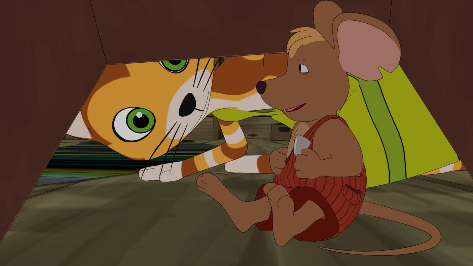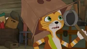 MäusejagdUnter einem Karton versteckt legt sich Findus auf dem Dachboden auf die Lauer, um eine Maus zu fangen.Bild: © ZDF/2021 Edel Germany GmbH