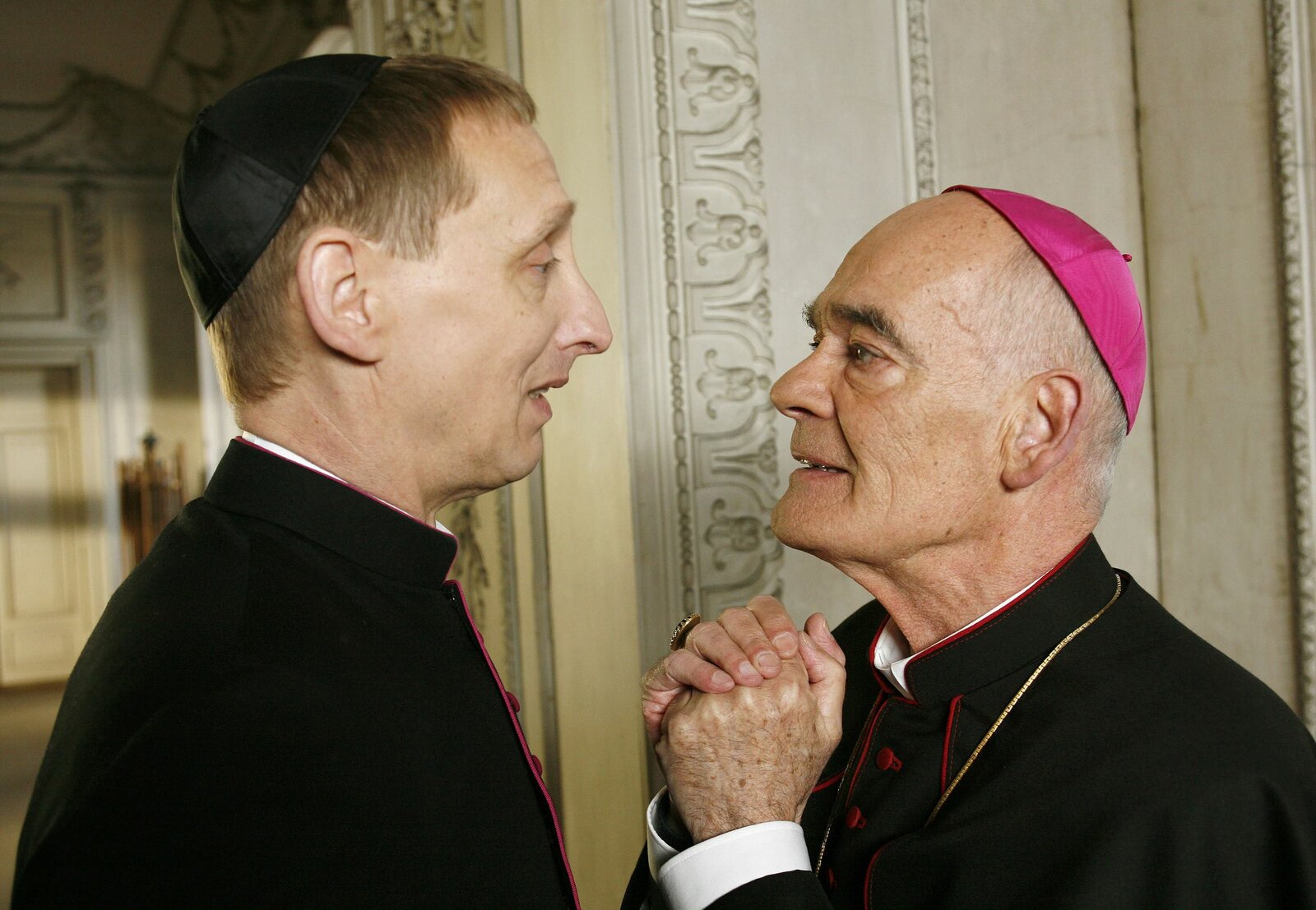 Ein Zeichen GottesBischof Hemmelrath (Hans-Michael Rehberg, re.) und Monsignore Mühlich (Gilbert von Sohlern) versetzen ihren urbayerischen Pfarrer mit dem Hang zum "Kriminalisieren" diesmal ausgerechnet nach Franken.Bild: © "ARD Degeto/ARD Degeto/Diane Krüger
