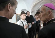 Ausgegeigt!Bischof Hemmelrath (Hans-Michael Rehberg, rechts) und Monsignore Mühlich (Gilbert von Sohlern, links) statten Pfarrer Braun (Ottfried Fischer, Mitte), dessen Haushälterin Inge Haller (Gundi Ellert) und Messdiener Armin (Antonio Wannek) eine Stippvisite ab.Bild: © "ARD Degeto/ARD Degeto/Jacqueline Krause-Burberg" (S2)