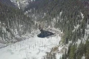 Der Kaindy-See - Kasachstans KleinodDer Kaindy-See entstand durch einen Erdrutsch und bedeckt seit 100 Jahren einen versunkenen Wald, der mit seinen gespenstischen Stämmen inmitten des Wassers steht.Bild: © ARTE / © French Connection Films/Duo2 TV/Ushuaia TV