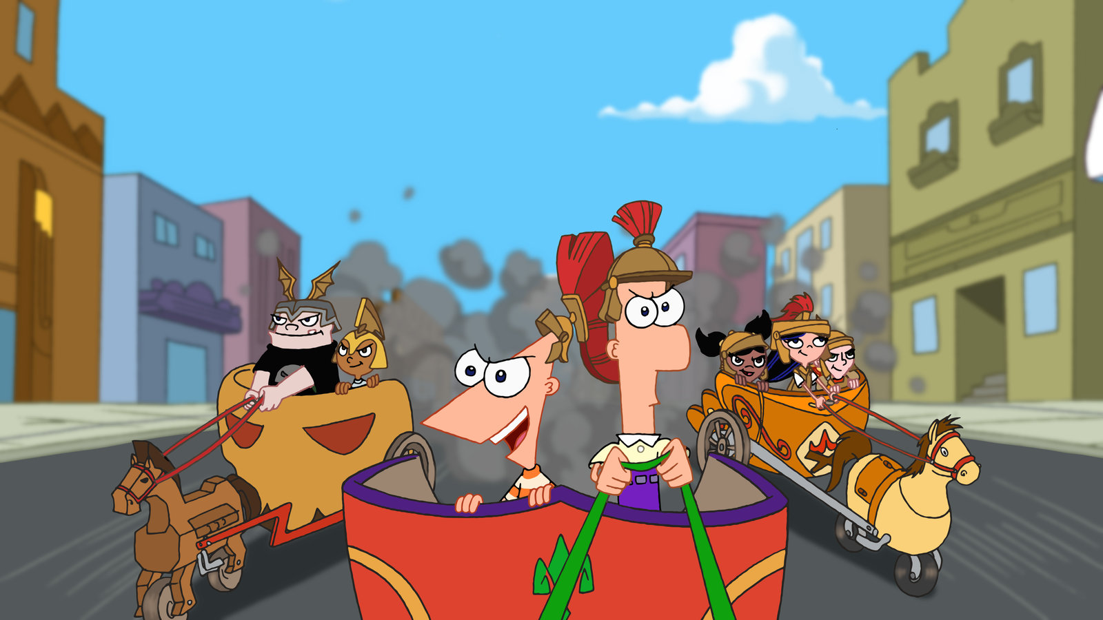 Das StreitwagenrennenPHINEAS AND FERB - "Greece Lightning" ?After Phineas and Ferb learn about Ancient Greece at their local museum, they set out to recreate a chariot race which turns into a raucous competition with Buford through the streets of Danville, on "Phineas and Ferb," airing SATURDAY, APRIL 19 (8:30 p.m., ET) on Disney Channel. (DISNEY CHANNEL) BUFORD, PHINEAS, FERB, ISABELLA AND FIRESIDE GIRLSBild: © 2008 DISNEY CHANNEL. All rights reserved. NO ARCHIVING. NO RESALE.