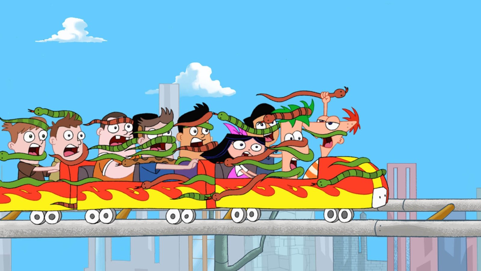Die AchterbahnEinzig Phineas (re.) zeigt sich vom Tempo der Achterbahn, die er gemeinsam mit seinem Stiefbruder Ferb gebaut hat, unbeeindruckt.Bild: © Disney Channel