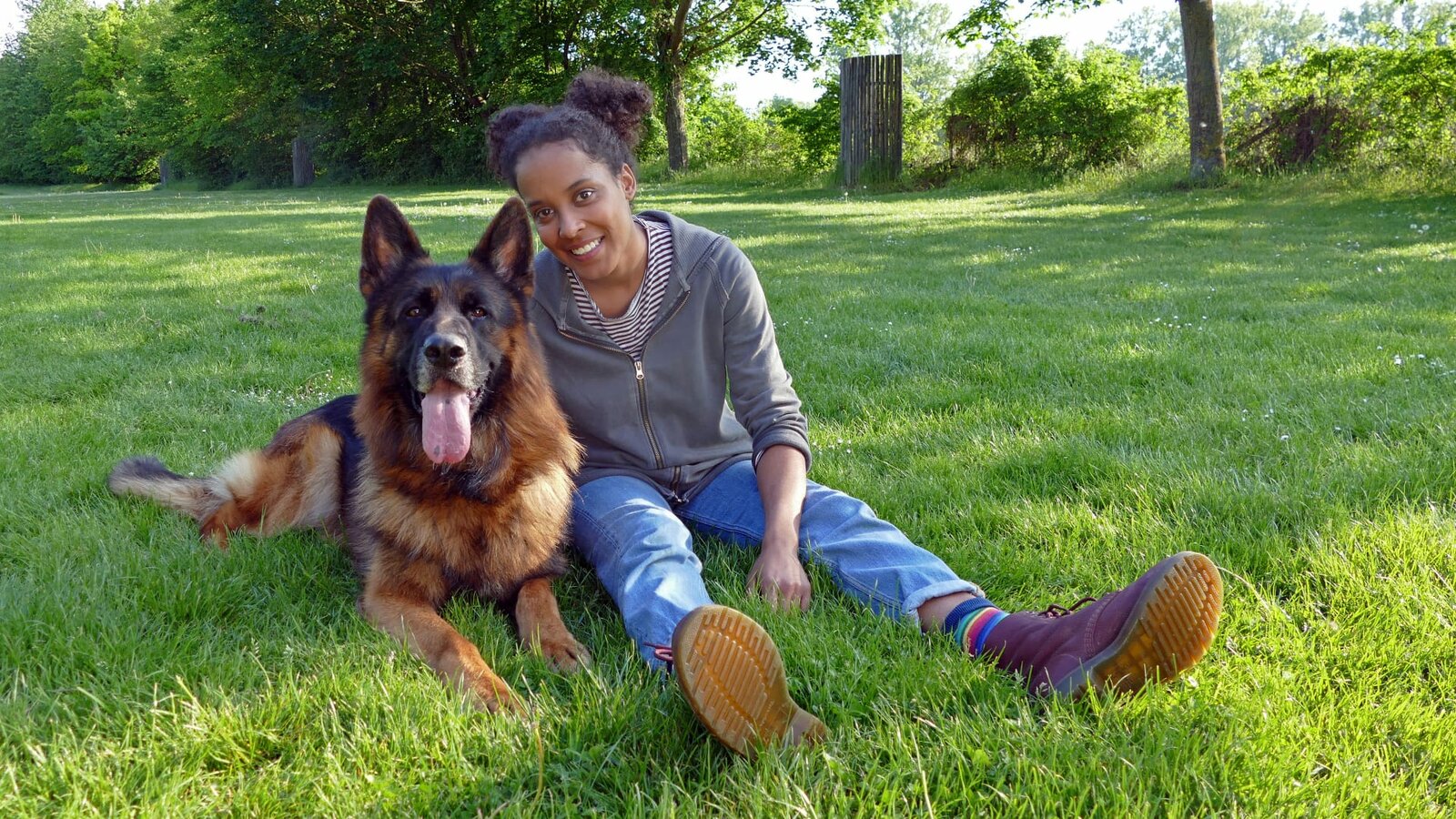 Deutscher SchäferhundPia und Schäferhund Onex ruhen sich auf einer Wiese aus.Bild: © BR/TEXT + BILD Medienproduktion GmbH & Co. KG/Kathrin Gutzeit