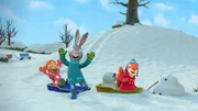 Das RodeltrainingPip und Posy helfen Jamila dabei, ihre Schneefrau zu reparieren.Bild: © ZDF/Magic Light Pictures LTD 2021