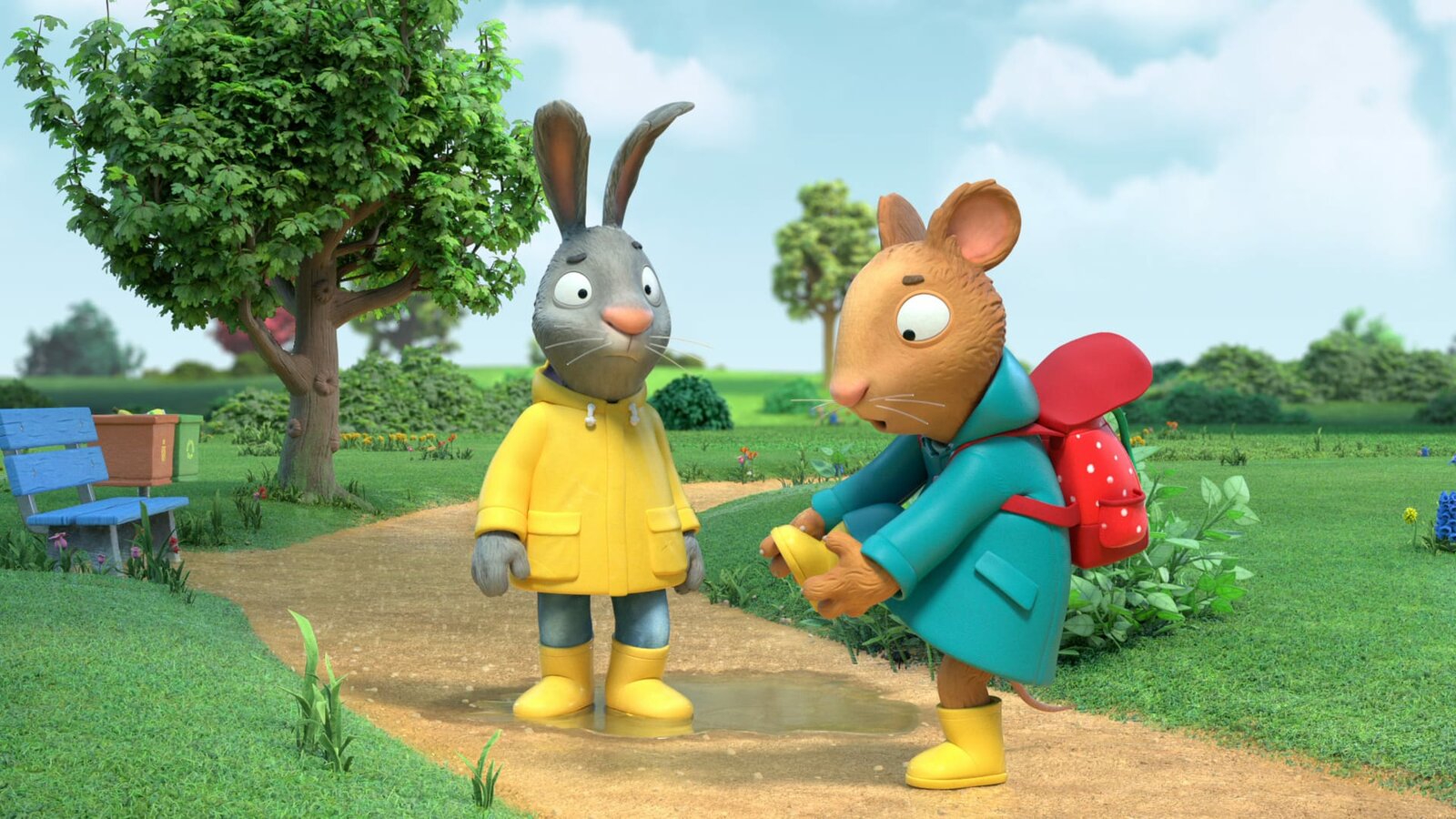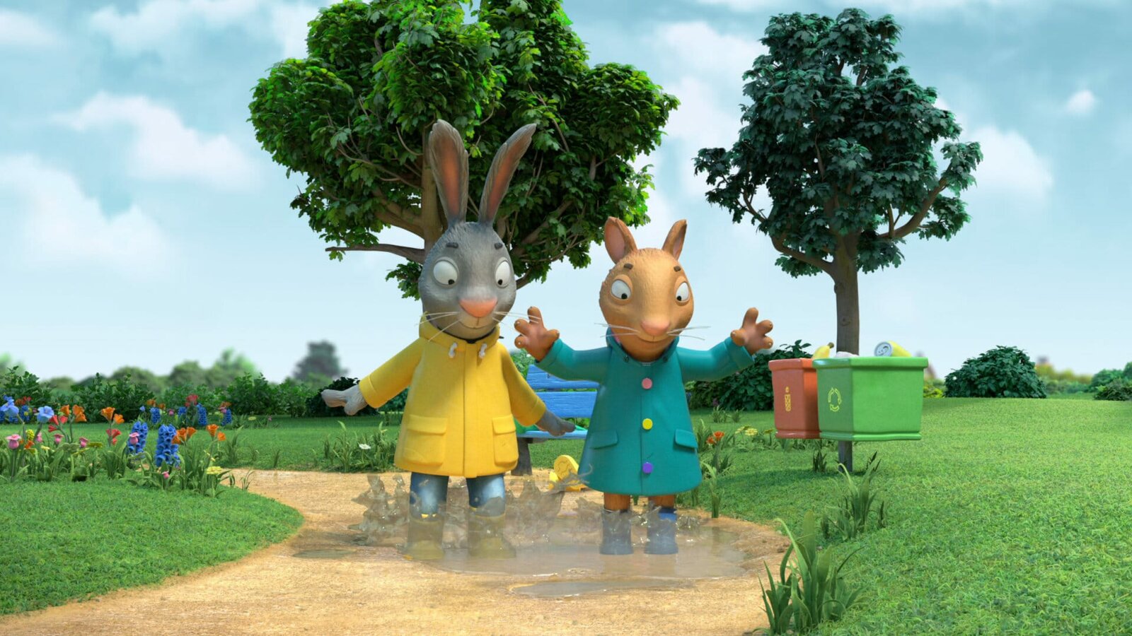 Ab in die Pfütze!Plitsch, platsch, in die Pfütze mit Pip und Posy.Bild: © ZDF und (c) Magic Light Pictures LTD 2021./(c) Magic Light Pictures LTD 202