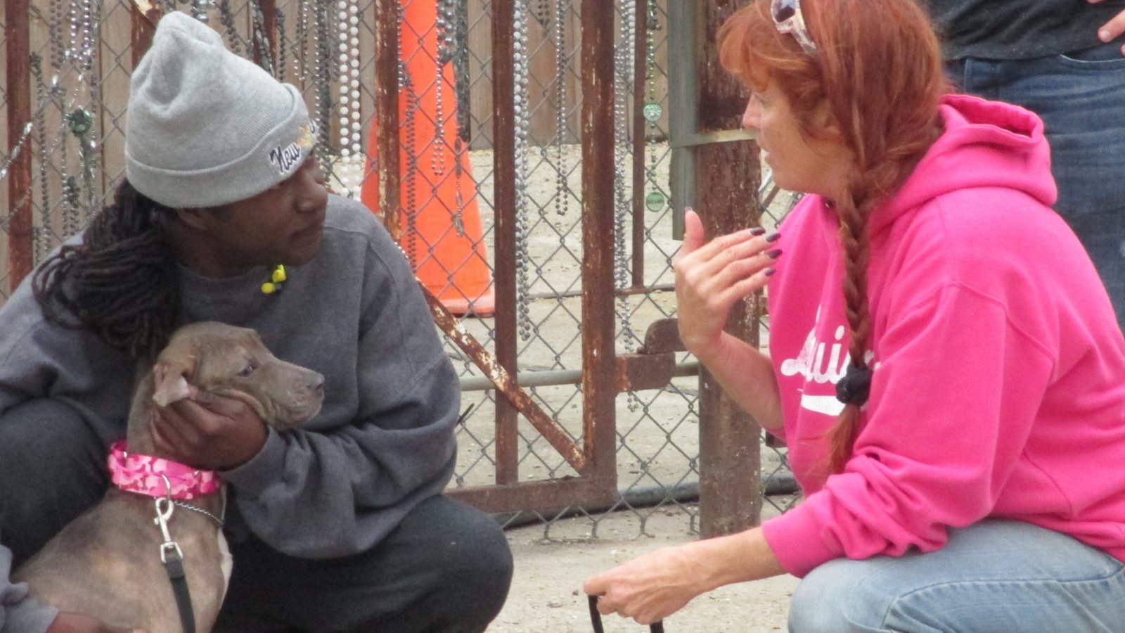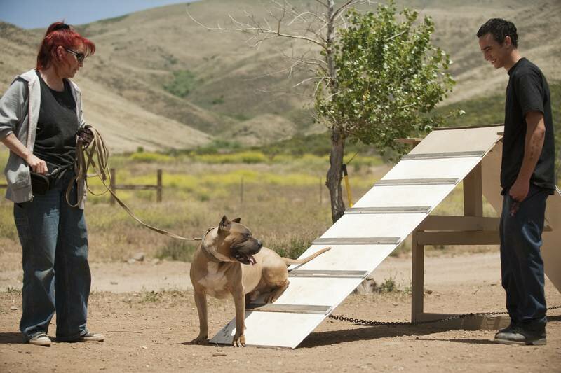 Beistand für CateTia Maria Torres talks with her adopted son Kinani about dog training before having Johnny Danger, a rescue pit bull, check out the a-frame that Kinani built as part of an agility training and confidence building exercise at Torres' Villalobos Rescue Center.Bild: © Animal Planet