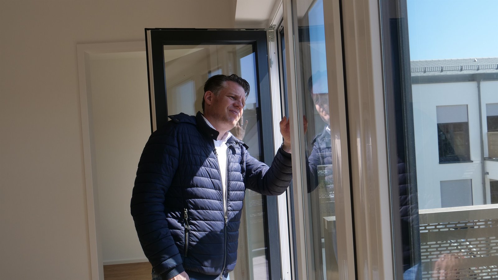 Billiger Wohnen: Bessere Bedingungen für MieterTobias Schmid kontrolliert die Fenster der Mitarbeiterwohnung.Bild: © ZDF und Frédérique Veith./Frédérique Veith
