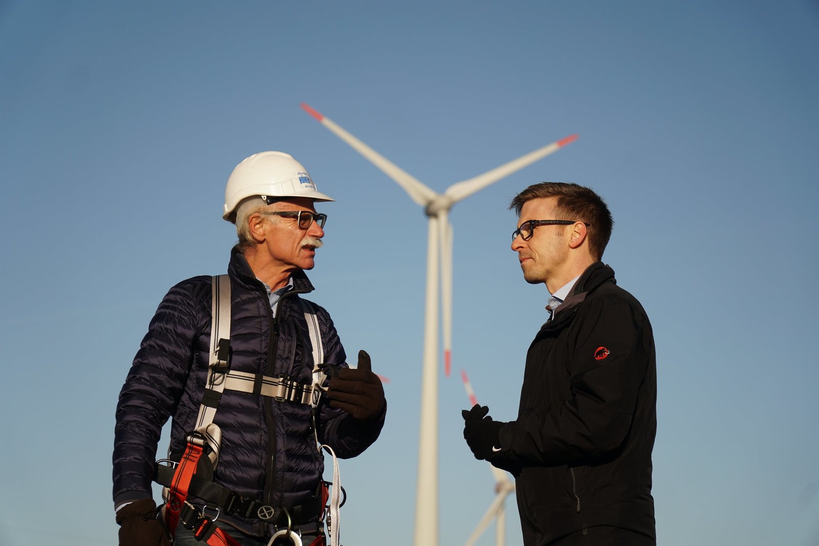 Windpionier Werner Vogt (l.) – hier mit Sohn Dominik (r.) - hat 1995 das erste Bürger-Windrad im Kreis Rhein-Hunsrück aufgestellt. Heute gibt es dort insgesamt 280 Windturbinen.Bild: © ZDF und Jasper Engel.