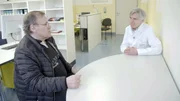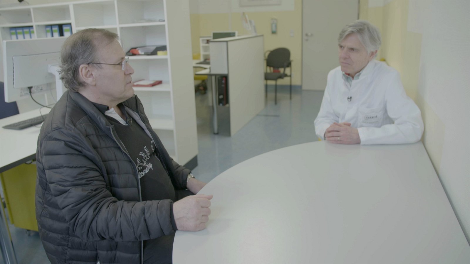 Schmerz-los - Wie neue Therapien Linderung bringenEin sehr großes Problem in der Schmerzmedizin: Weltweit steigt der Pro-Kopf-Konsum von süchtig machenden Opioiden an, auch in Deutschland. Christoph Stein (r.) von der Charité Berlin im Gespräch mit einem Patienten, der süchtig nach Schmerzmitteln war.Bild: © ZDF und Patrick Meyer- Clement.