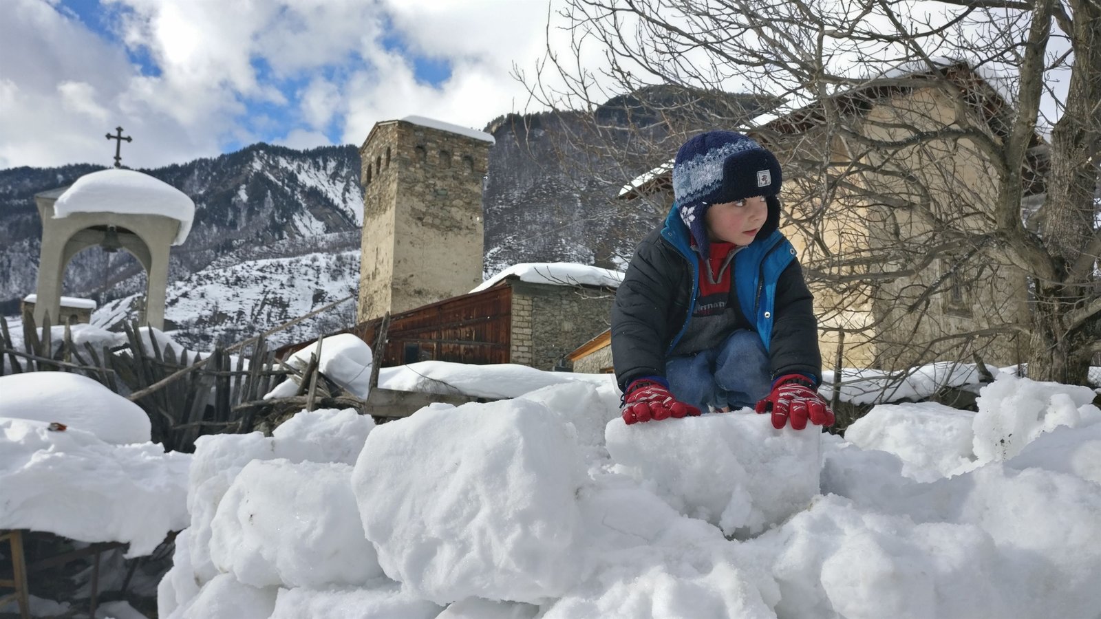 Alle Jungen und Männer des svanetischen Dorfes Lengeri müssen beim Schneeturmbau helfen.Bild: © MedienKontor / Carolin Reiter