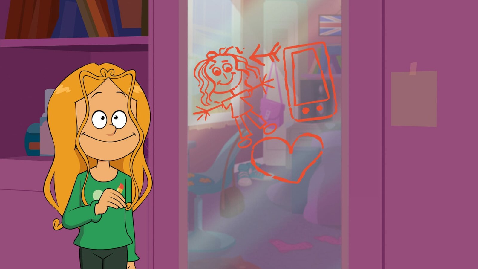 So ein Horror!Marine betrachtet stolz ihr Lippenstift-Graffity, mit dem sie Wendy daran erinnert, dass sie ihr das alte Handy versprochen hat.Bild: © NDR/Bamboo Production/Samka Productions