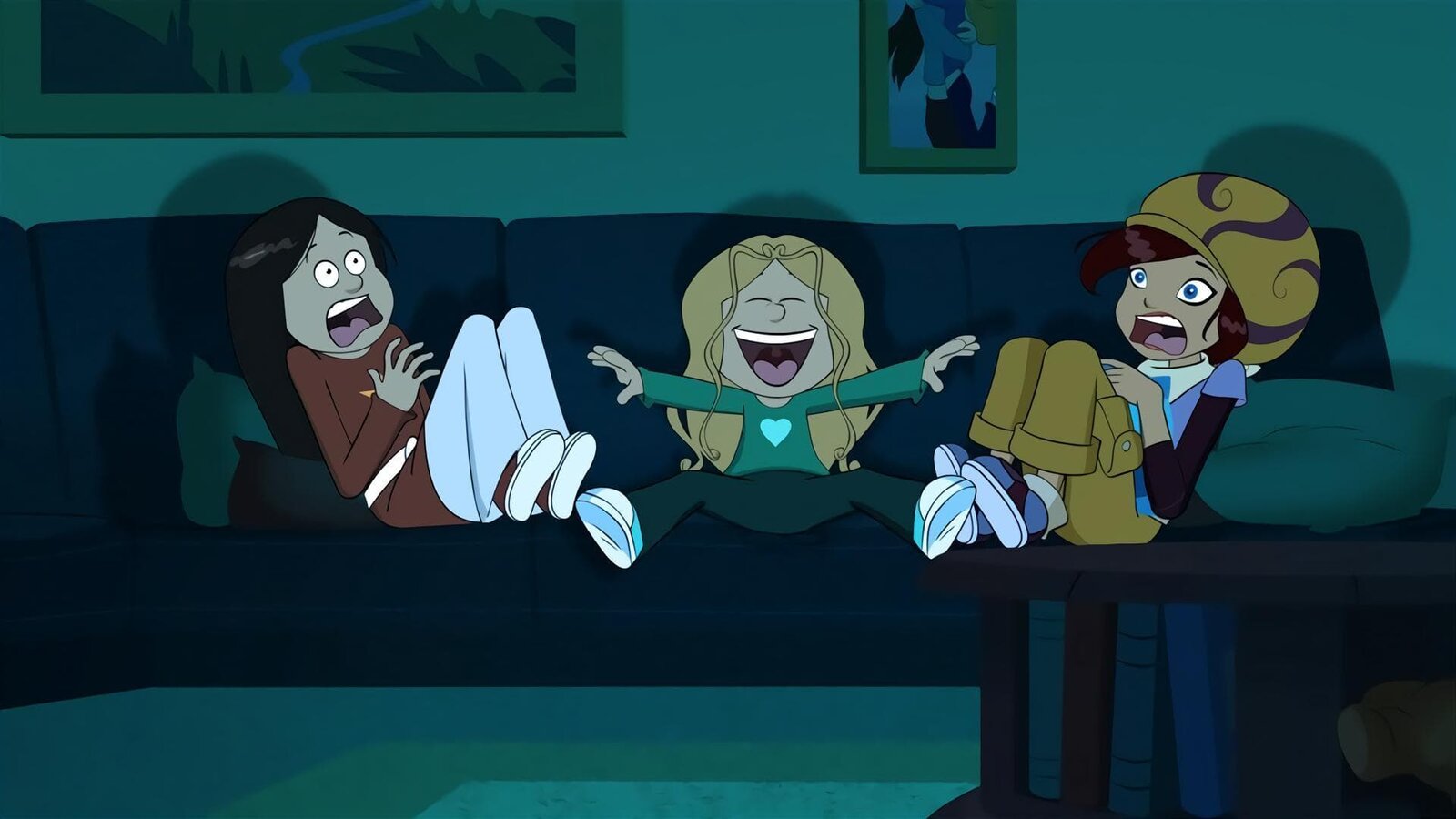 Wie im Mittelalter!Marine drängt sich auf, als Wendy sich mit Sammie in aller Ruhe bei einem Horrorfilm gruseln will.Bild: © NDR/Bamboo Production/Samka Productions