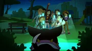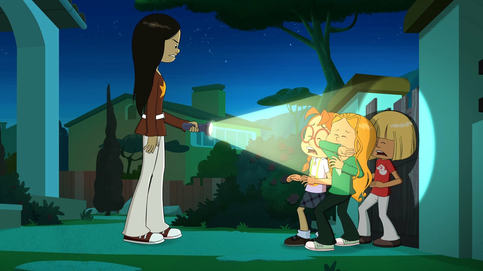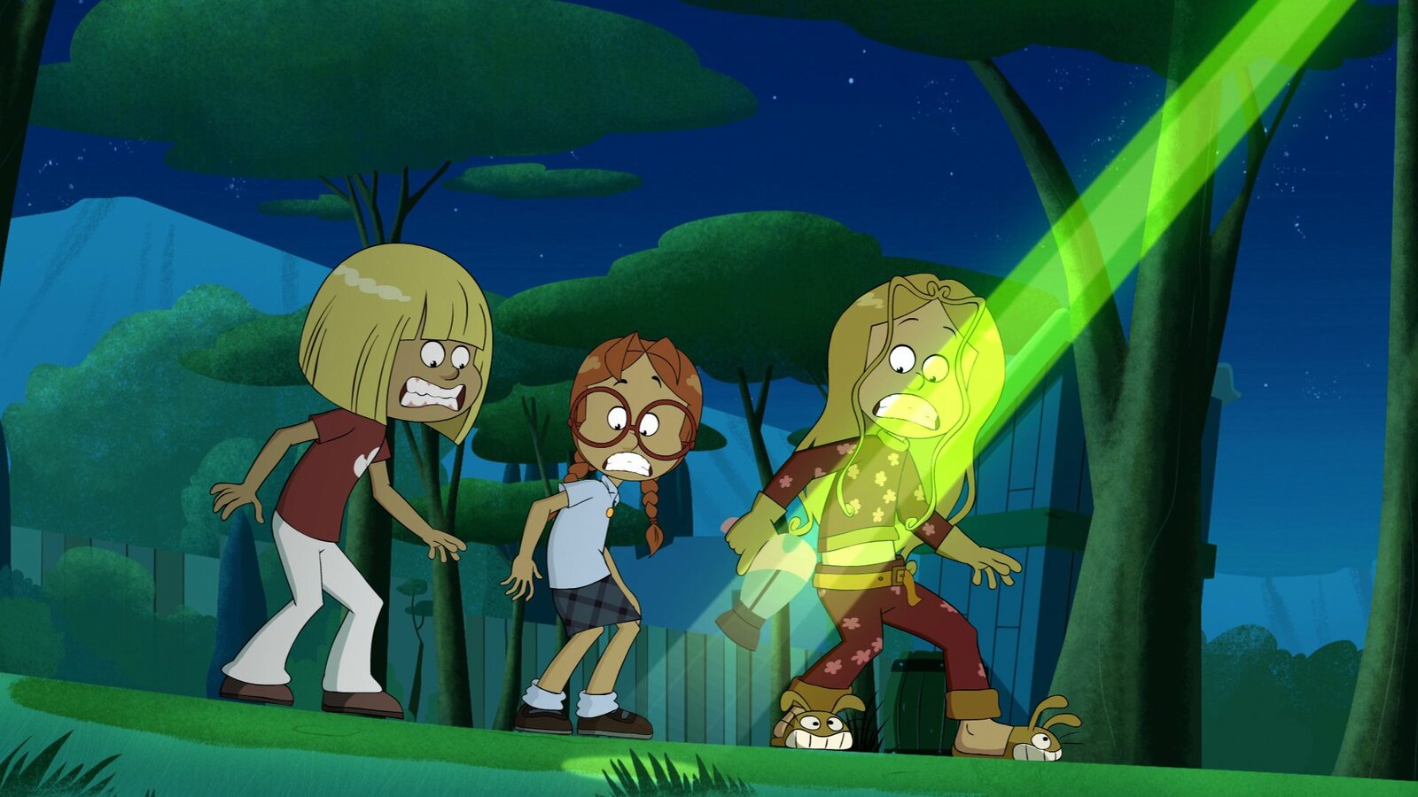 Eine galaktische LiebeNachts verbergen sich Lulu, Nat und Marine ängstlich vor einem grünen Ufo-Lichtstrahl im Garten, der sie fast erfasst hat.Bild: © KiKA