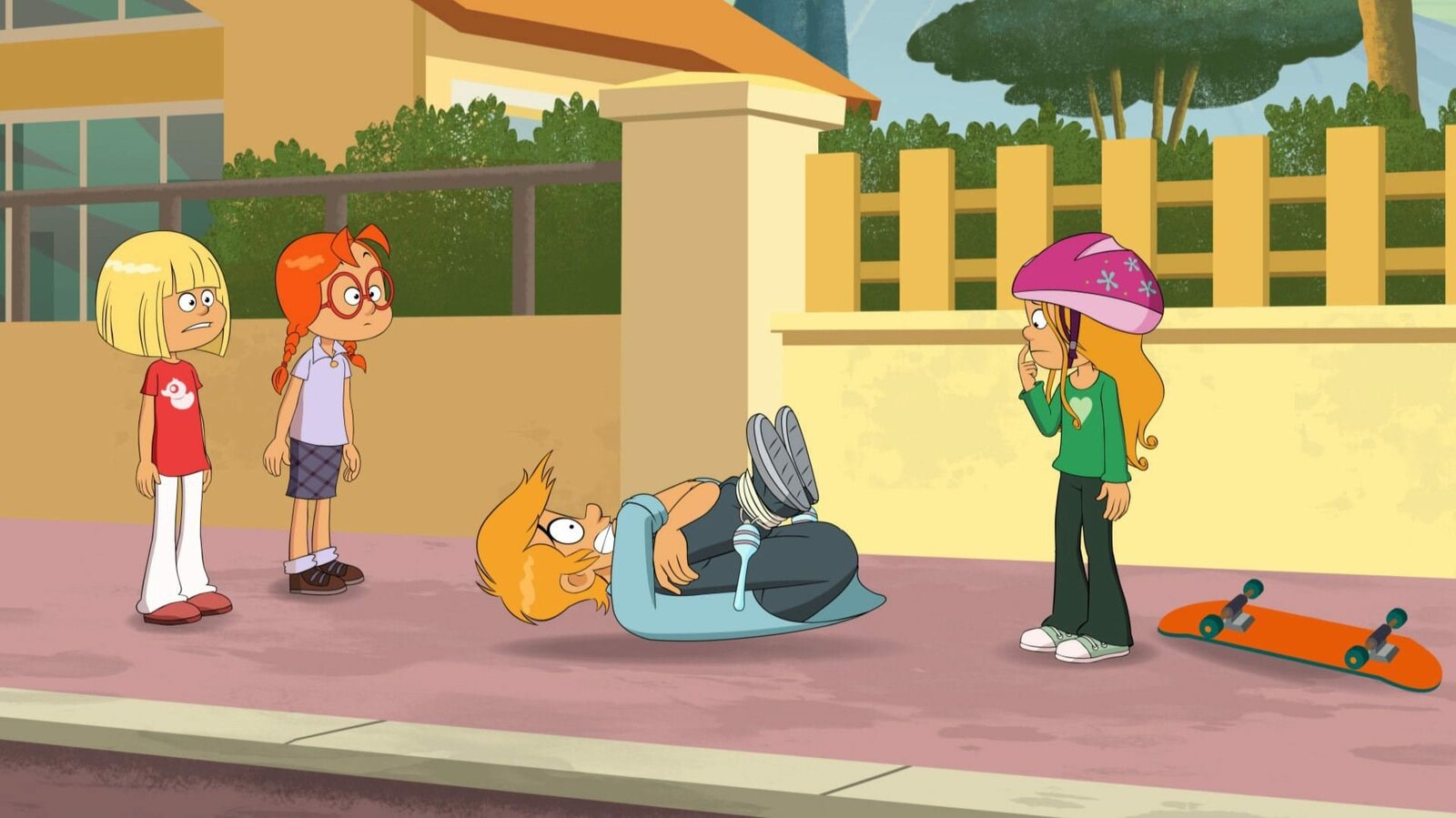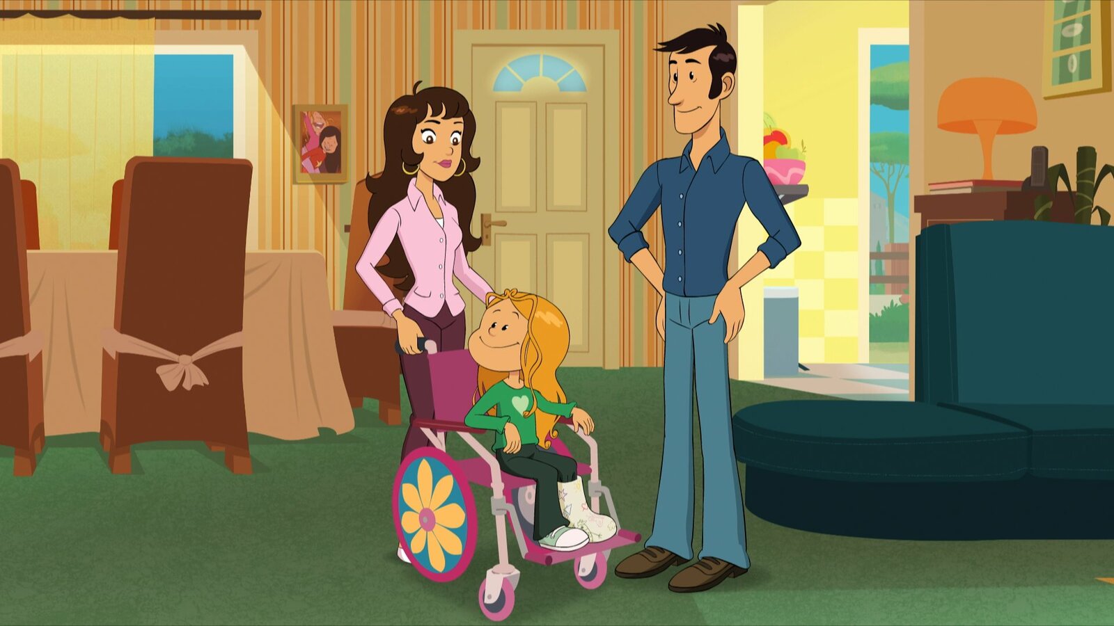 Himmel und HölleWegen des gebrochenen Beins bekommt Marine einen Rollstuhl von ihren Eltern.Bild: © KiKA