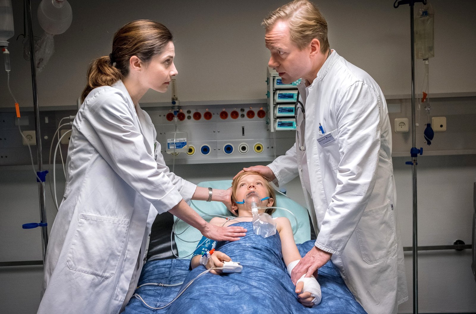 Unter CampernEin Notfall: Dr. Heckmann (Patrick Heyn) und Dr. Maja Pirsich (Anne Werner) behandeln den kleinen Tim (Frederik Stein).Bild: © ARD Degeto/Boris Laewen