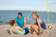 Unter CampernDer Schmetterball von Nora (Tanja Wedhorn, re.) hat Joanna (Anja Antonowicz) ins Gesicht getroffen. Der fürsorgliche Richard (Stephan Kampwirth) ist sofort zur Stelle.Bild: © ARD Degeto/Boris Laewen