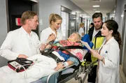 Der ProzessNora (Tanja Wedhorn, 2. v. li.) liefert eine Patientin (Dagmar Laurens) im Krankenhaus ein. Wie immer gibt Dr. Heckmann (Patrick Heyn) wenig auf ihre Meinung. Krankenhausärztin Dr. Pirsich (Anne Werner) und Rettungsassistent Uwe (Andreas Birkner) sehen zu.Bild: © ORF/Degeto/Christoph Assman