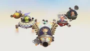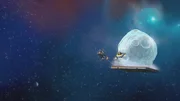 Groobie und Pootle bringen mit Hilfe ihrer Raumschiffe einen großen Klumpen Eis zu Fred.