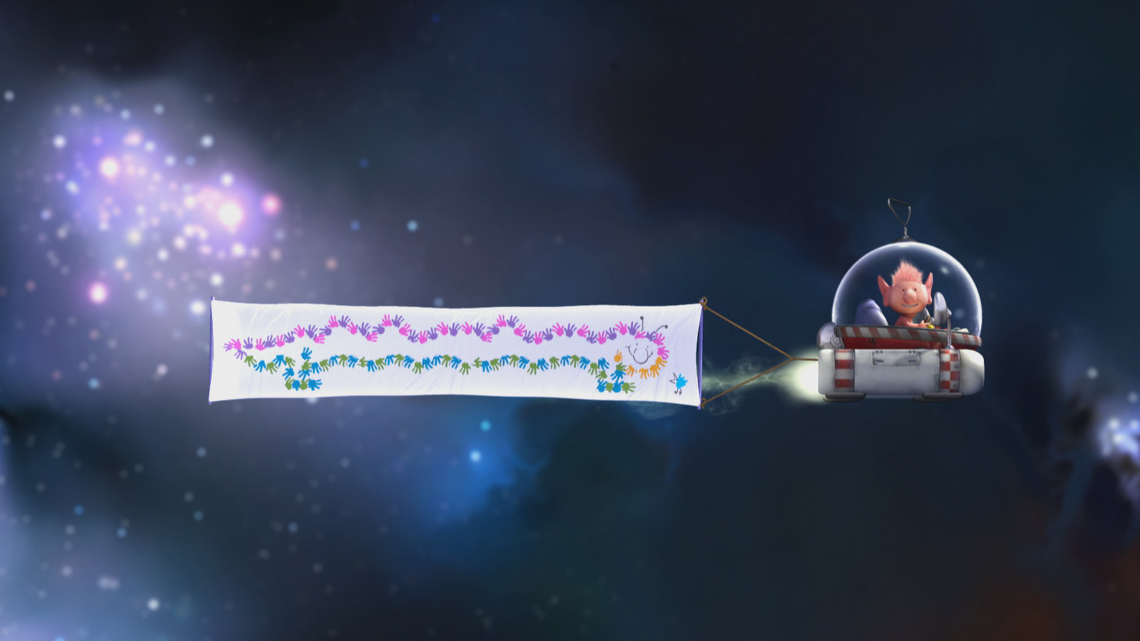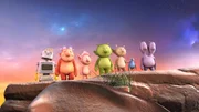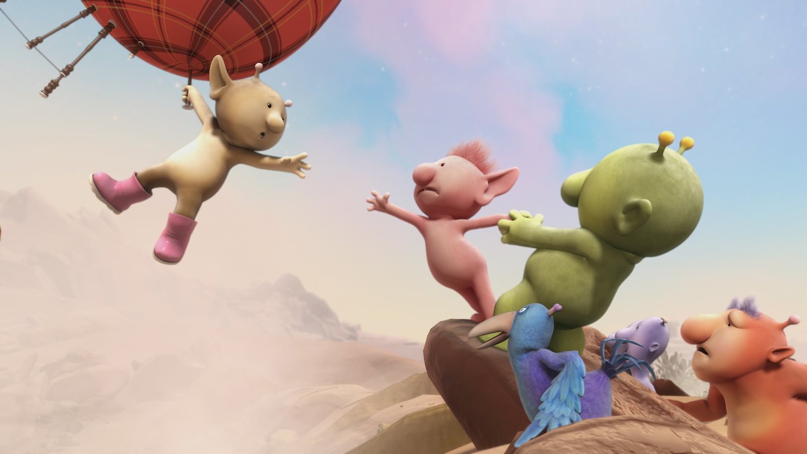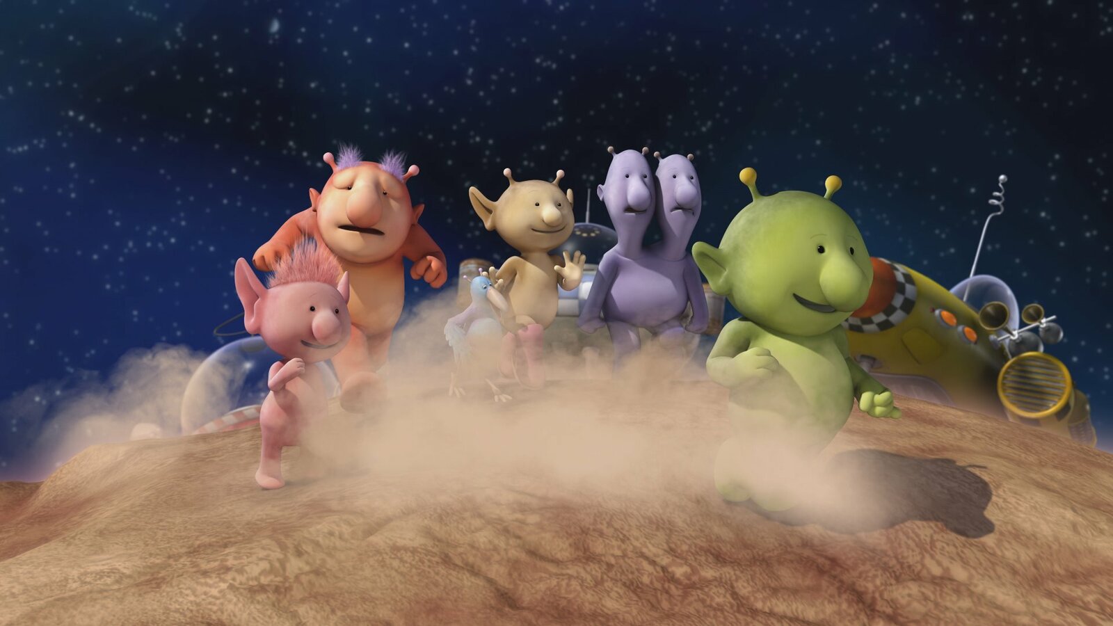 Krah, Stella, Bud-D, Eddi und Groobie (v.l.n.r.) beobachten, wie Pootle und Oopsy mit dem Raumschiff durch den Nebel fliegen.