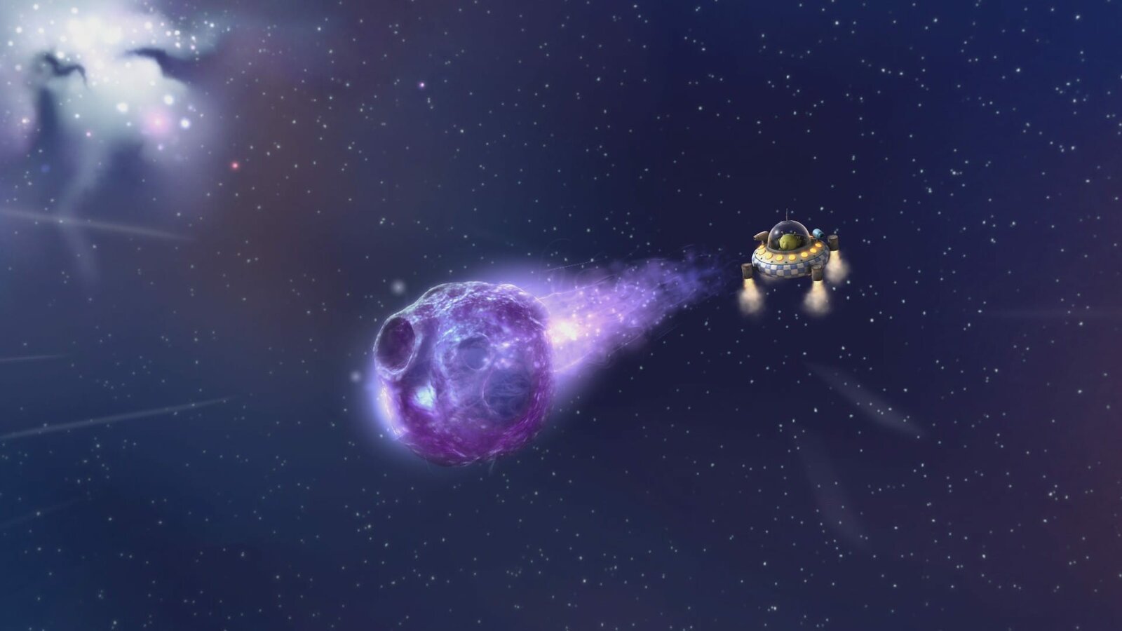 Pootle nimmt den Asteroiden von seinem Raumschiff aus genauer unter die Lupe.