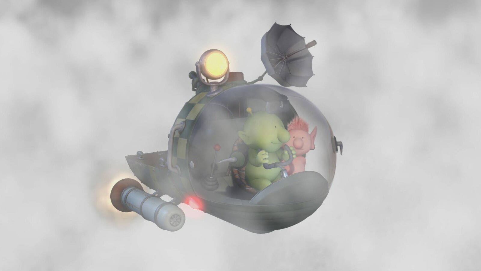 Pootle und Oopsy fliegen im Raumschiff durch den dichten Nebel über Okidoki.