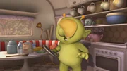 Kosmisches FlirrelnZur Feier des Tages wollen die Freunde eine Party feiern. Pootle bereitet Eierkuchen vor. Das ist gar nicht so einfach!Bild: © KiKA/Snapper Productions/Q Pootle 5 LTD