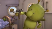 Wackeln ja, aber nicht fallen!Oopsy hebt in ihrer Ungeduld hebt mit ihrem kaputten Raumschiff ab, noch bevor Pootle mit der Reparatur fertig ist.Bild: © KiKA/Snapper Productions/Q Pootle 5 LTD