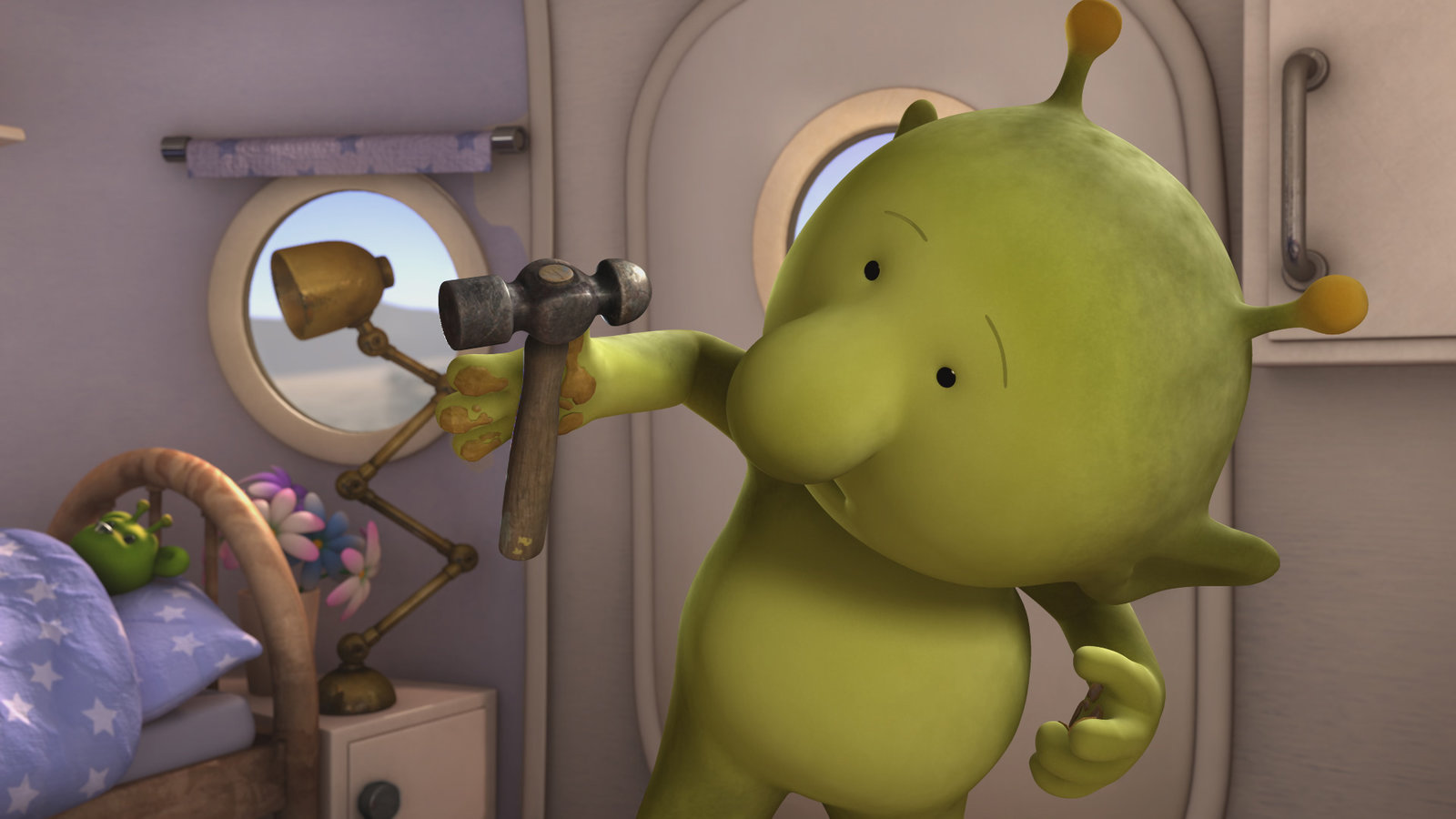 Groobies SpezialmagnetGroobie hat bei seinem Überflug mit dem Spezialmagneten am Raumschiff aus Versehen Pootles Haus in die Luft gerissen.Bild: © KiKA/Snapper Productions/Q Pootle 5 LTD